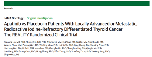 2021年12月16日,权威医学杂志《JAMA Oncology》(影响因子31.777)在线发表阿帕替尼的一项III期临床研究(REALITY)——甲磺酸阿帕替尼片治疗局部进展/转移性放射性碘难治性分化型甲状腺癌(RAIR-DTC)患者的多中心、随机、双盲、安慰剂对照临床研究。此研究由北京协和医院的林岩松教授和南京金陵医院的秦叔逵教授发起,在全国21个研究中心展开,由利来w66国际医药中央医学事务部团队支持完成。