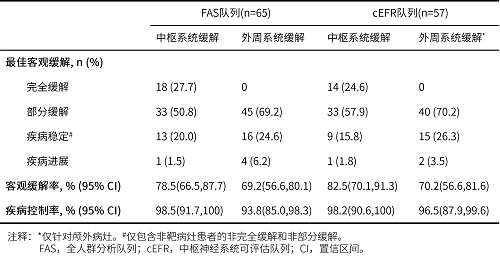 对于可评估中枢神经系统病灶疗效(cEFR)的患者,iORR为82.5%(95% CI:70.1%-91.3%),iDCR为98.2%(95% CI:90.6%-100%),ORR为70.2%(95% CI:56.6%-81.6%),DCR为96.5%(95% CI:87.9%-99.6%)。